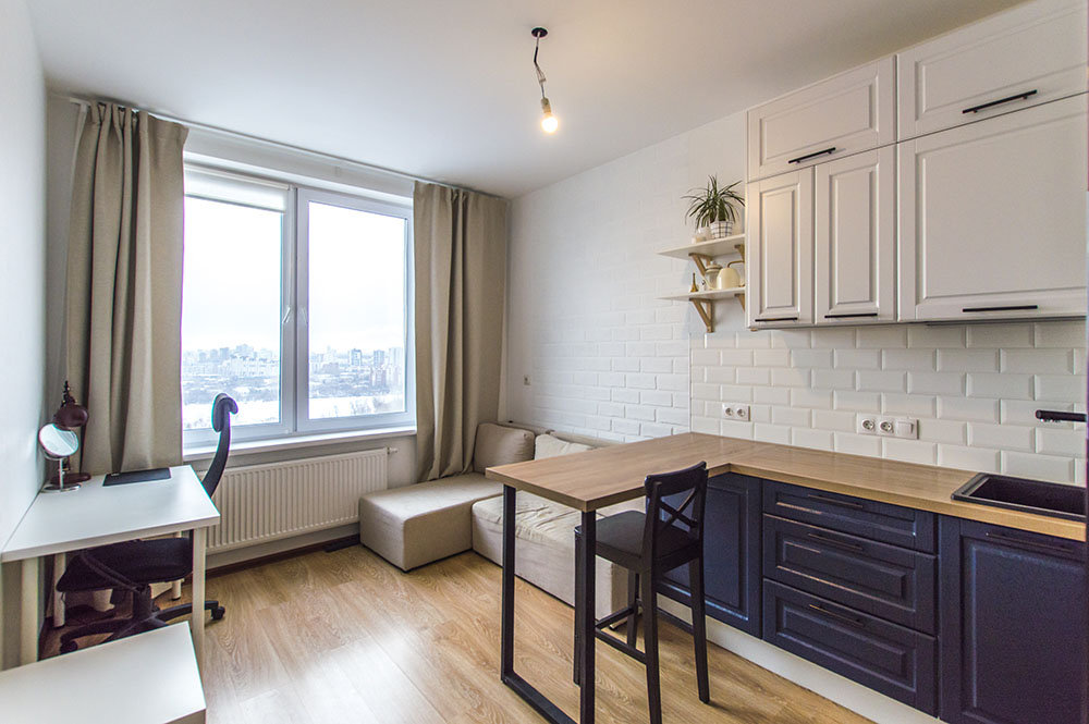 В квартире очень удачно зонирована кухня, гарнитур в идеальном состоянии и встроенная техника уже входят в стоимость. В кухонном смесителе встроен фильтр для воды, вам не нужно бегать с пятилитровками. Рабочая зона с таким видом на центр города это мечта фрилансера и просто мечта. Еще одна классная особенность планировки это гардеробная, фурнитура и полки в ней так же остаются. Благодаря гардеробной сезонные вещи можно не хранить на балконе, а оставить его для наслаждения видами. Спальня имеет правильную форму и также нишу под шкаф. Одним словом грамотная планировка квартиры подойдет и молодой семье и в качестве первого жилья и под инвестиции.