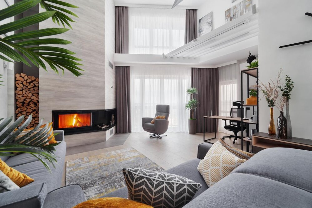 Уникальность объекта состоит в его архитектурных особенностях, квартира расположена на последнем этаже многоквартирного жилого комплекса. В результате в гостиной имеется второй свет с высотой стен 6 метров и это позволило установить настоящий камин, с живым огнем.