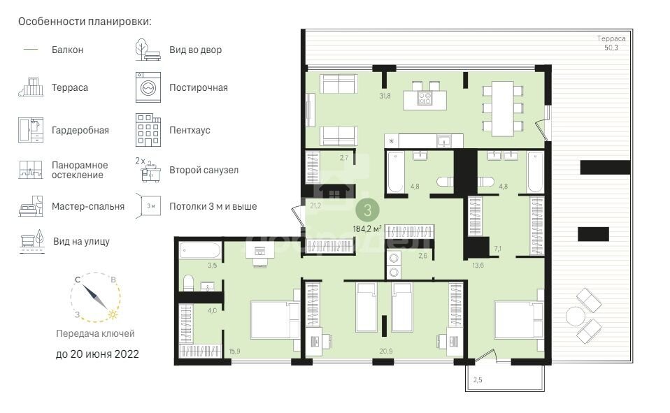 Преимущества данной квартиры : Пентхаус, Потолки 3 м и выше., Панорамное остекление, Терраса, постирочная, мастер спальня, ПРОСТОРНЫЕ КОМНАТЫ правильной формы.