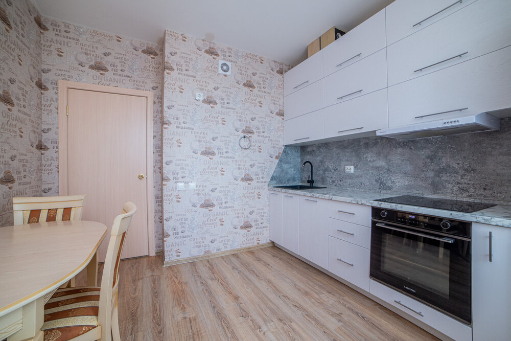 Кухня оборудована встроенной мебелью и техникой: индукционная варочная панель, жарочный шкаф и посудомоечная машина Leran, холодильник «Аристон».