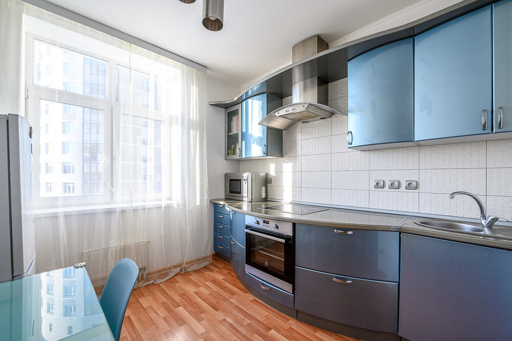 На кухне гарнитур фирмы «Мария». Встроенная техника: холодильник, посудомоечная машина, стиральная машина, варочная поверхность на 2 конфорки, духовой шкаф. Отдельно: микроволновая печь. Стол и табуретки. Под окном оборудован большой уличный холодильник с морозостойкой дверью.