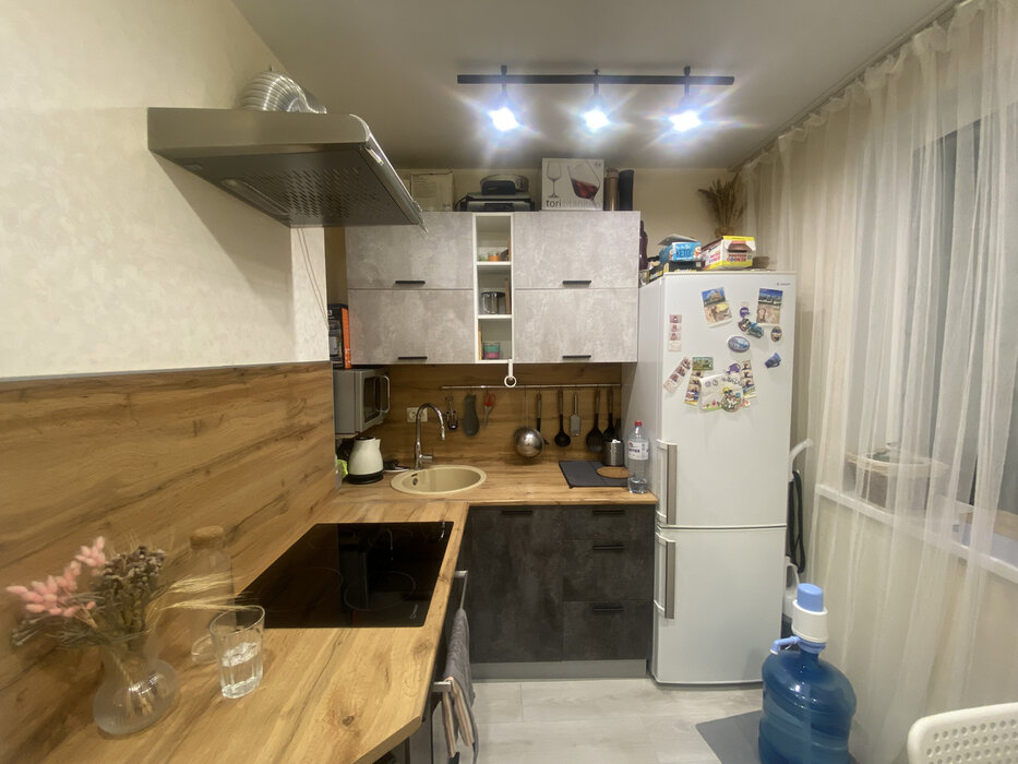 Установлен кухонный гарнитур ,который остается в квартире вместе с бытовой техникой.