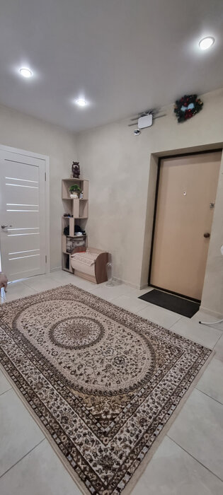 Коридор очень просторный 10м2, встроенный шкаф купе во всю длину прихожей. На полу керамическая плитка в прихожей, ванной, на кухне.