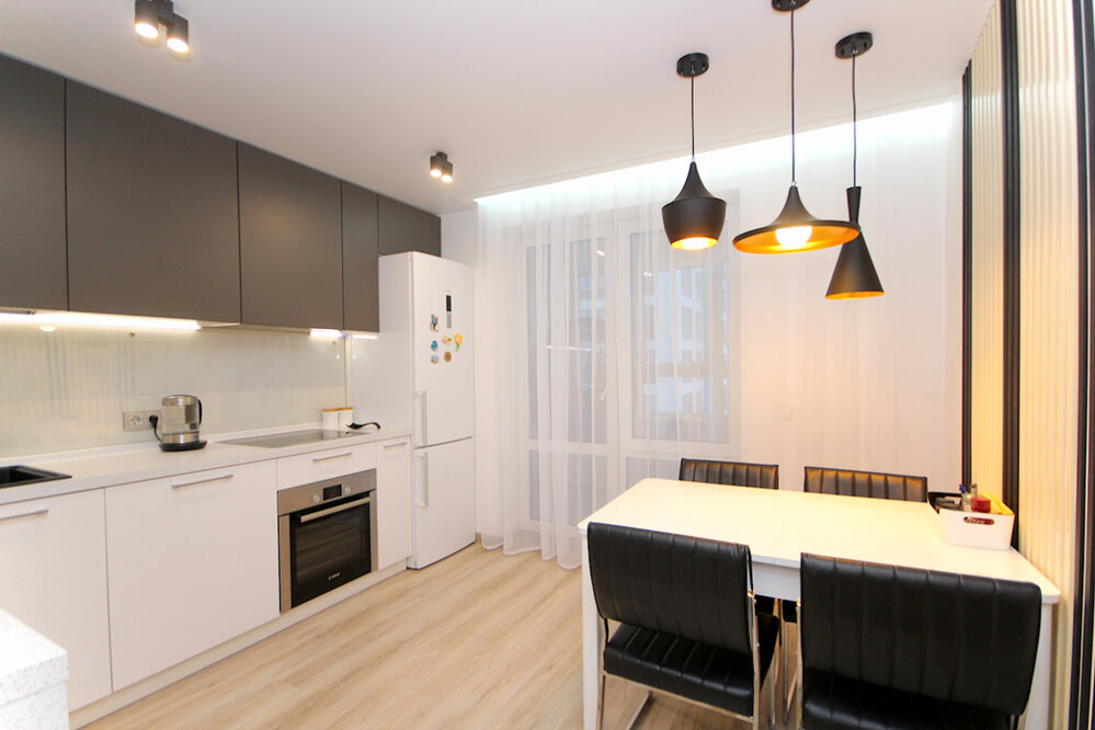 - Просторная кухня с отличным функциональным кухонным гарнитуром. Встроенная техника Electrolux – варочная поверхность, духовой шкаф, микроволновка, посудомоечная машина, холодильник, вытяжка. Раковина оборудована фильтром для питьевой воды. В зоне кухни находится стол - остров со встроенными шкафами и барными стульями.