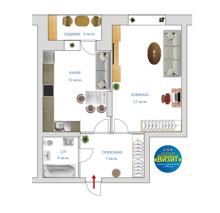 Общая площадь квартиры составляет 39 кв. м., жилая комната 17 кв. м., большая кухня 13 кв. м. Отдельно к площади квартиры трехметровая застекленная лоджия с выходом из кухни. В семиметровой прихожей установлен шкаф-купе, который остается в подарок покупателю.