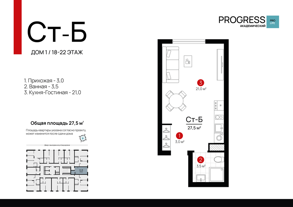 Екатеринбург, ул. Амундсена, 130/2, ЖК "PROGRESS (Прогресс) Академический" (Дом 1) - фото квартиры 8 ноября 2025 90 дн. 1 32.55 4/22 4 300 000