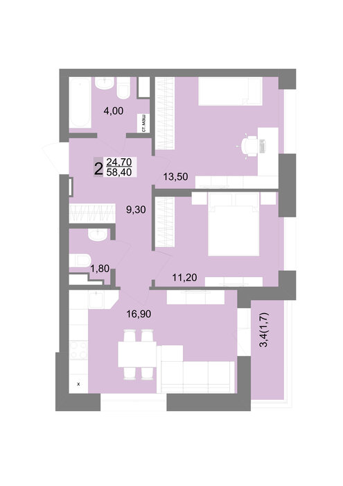 Общая площадь:58 м2