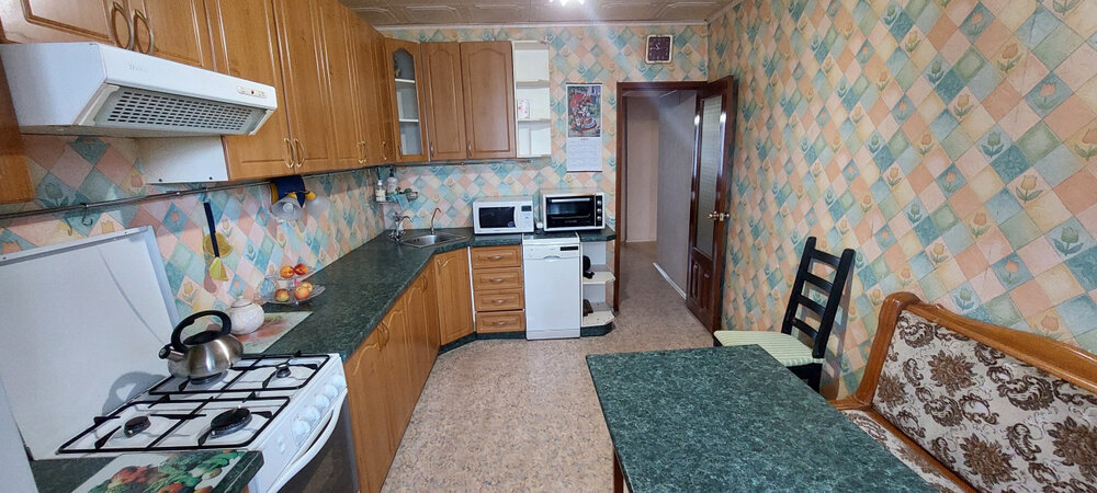 Кухонный гарнитур с газовой плитой и шкаф уже ждут новых хозяев.