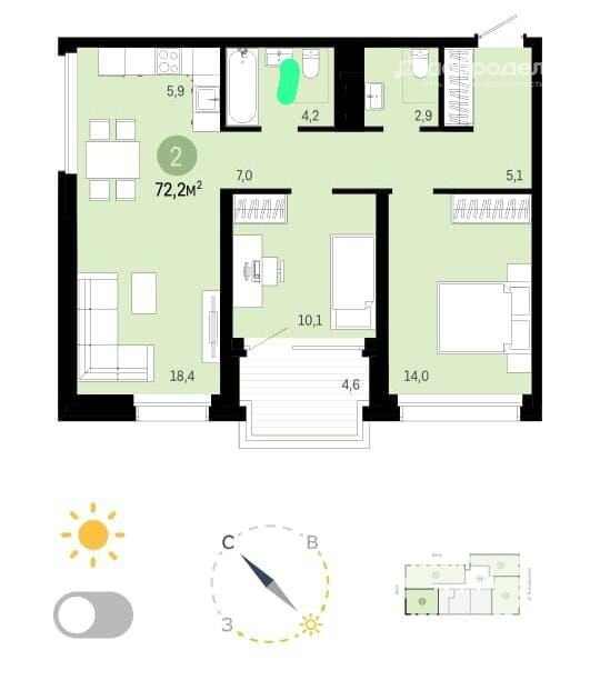 - Эргономичная планировка, кухня-гостинная 25 м2, можно зонировать на хозяйскую и гостевую.