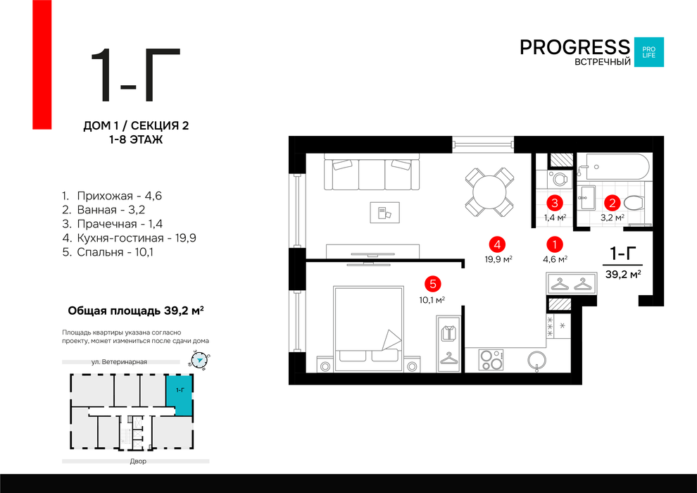 • 1-к квартира, Ветеринарная, 16/1, Жилой комплекс “PROGRESS Встречный” — 1 кв. 2026 г.
