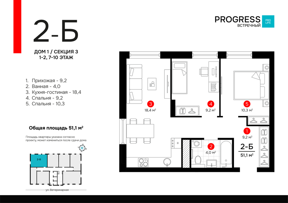 • 1-к квартира, Ветеринарная , 16/2, ЖК “PROGRESS Встречный” — 02 кв. 2027 г.
