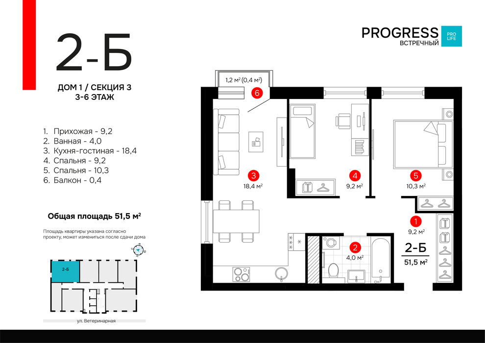 • 1-к квартира, Ветеринарная, 16/1, Жилой комплекс “PROGRESS Встречный” — 1 кв. 2026 г.