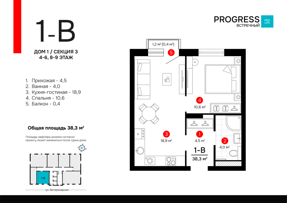 • 1-к квартира, Ветеринарная, 16/1, Жилой комплекс “PROGRESS Встречный” — 1 кв. 2026 г.