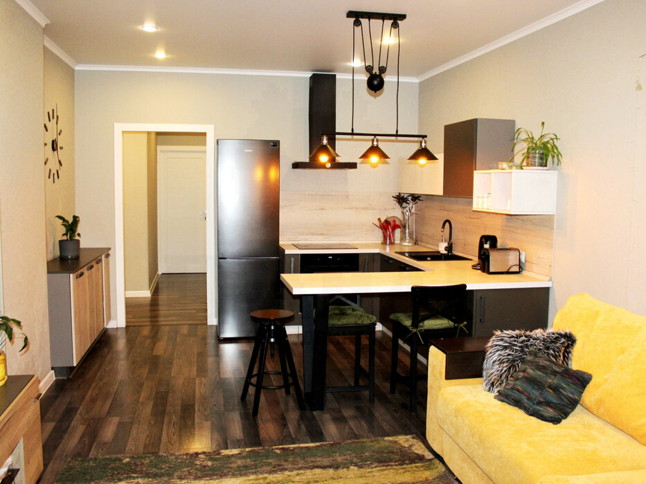 КВАРТИРА: В квартире большая кухня – гостиная 24,5 квм и две просторные изолированные комнаты 14,0 и 14,2 квм., есть гардеробная. Квартира светлая и очень теплая. Окна выходят на разные стороны. В квартире сделан дизайнерский ремонт с использованием современных материалов. В подарок покупателю остается кухонный гарнитур и встроенная техника. Все в квартире делалось для себя с большой любовью.