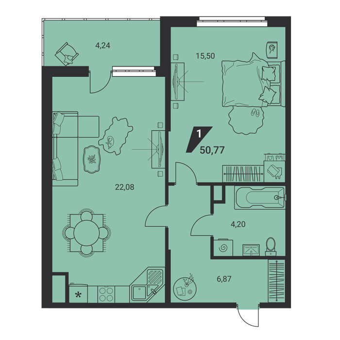 Общая площадь:50.77 м2