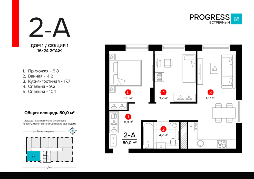 • 1-к квартира, Ветеринарная, 16/1, Жилой комплекс “PROGRESS Встречный” — 1 кв. 2026 г.