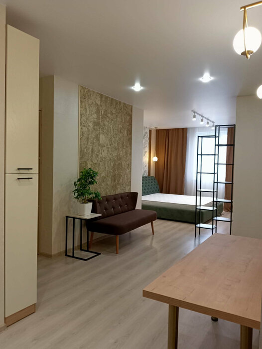 Одна комната изолированная (спальня). Другая комната (гостиная) совмещена с кухней (по проекту дома). Гостиная и рабочая зона кухни зонированы (разделены перегородкой, предусмотренной проектом дома).