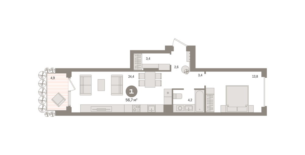 Квартира с объединенной кухней-гостиной и одной спальней в квартале «Депо». Особенности планировки: терраса, вид во двор, отделка под чистовую, гардеробная, панорамное остекление.
