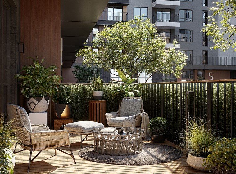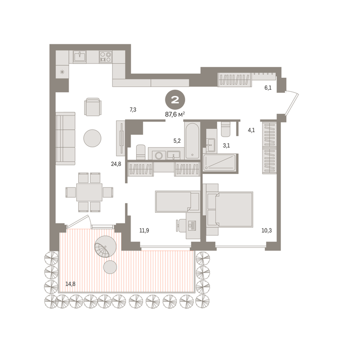 Квартира с кухней-гостиной и двумя спальнями в квартале «Депо». Особенности планировки: второй санузел, терраса, вид во двор, окна в пол, предчистовая отделка, мастер-спальня, панорамное остекление.
