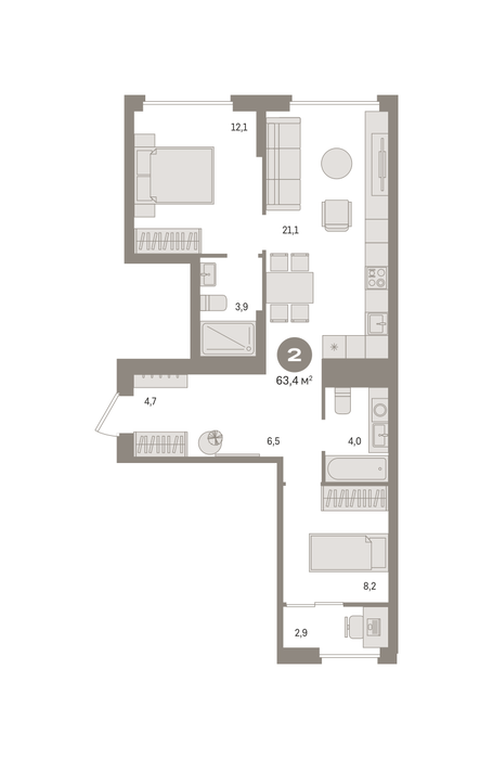 Двухкомнатная квартира в квартале «Депо» - это квартира с объединенной кухней-гостиной, двумя спальнями и ванной комнатой. Купить квартиру выгодно напрямую от застройщика Брусника.