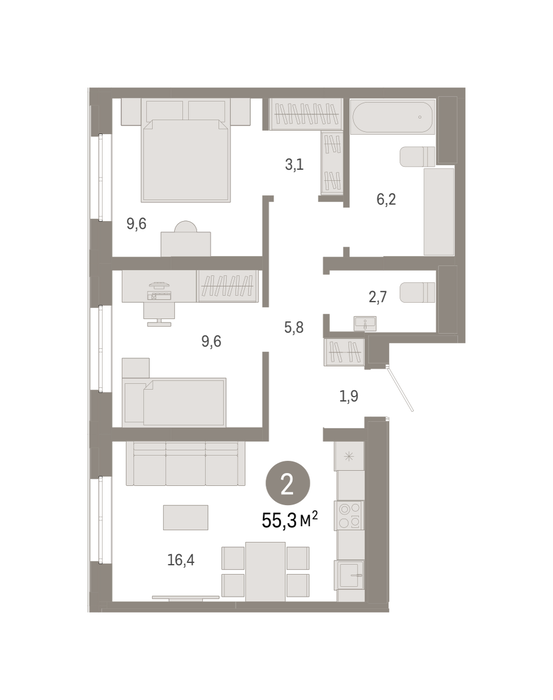 Двухкомнатная квартира в «Южном квартале» — это квартира с большой кухней, которая объединена с гостиной, и двумя спальнями. Кухня-гостиная — это общественное пространство квартиры, где удобно собираться с семьей и друзьями. Здесь легко поместится зона приготовления пищи, стол со стульями для совместных трапез, мягкие места для отдыха и телевизор. Купить двухкомнатную квартиру в юго-западном районе Екатеринбурга рядом с автовокзалом выгодно напрямую от застройщика «Брусника».