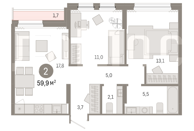 Продаётся двухкомнатная квартира, с хорошей планировкой. Вместительная кухня-гостиная с панорамным окном и выходом на собственную террасу, будет буквально залита днем солнечным светом. В спальнях также будет много света, за счёт больших окон. Имеется также вместительная прихожая с нишей под шкаф – купе и два раздельных санузла.