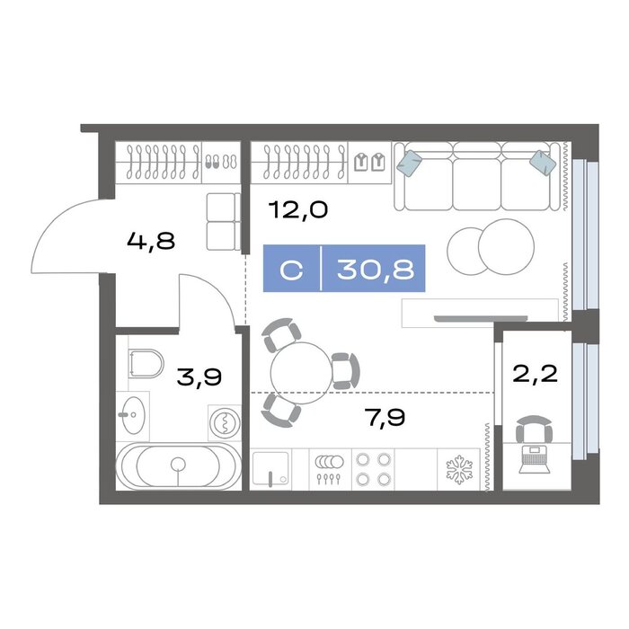 Общая площадь:30.8 м2