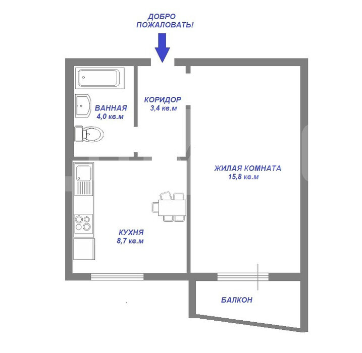 Вместительная кухня (9) кв.м. Просторная комната (15) кв.м. с выходом на застекленную лоджию (5 кв.м.) позволяет организовать место для отдыха, т.к. из окон красивый вид.