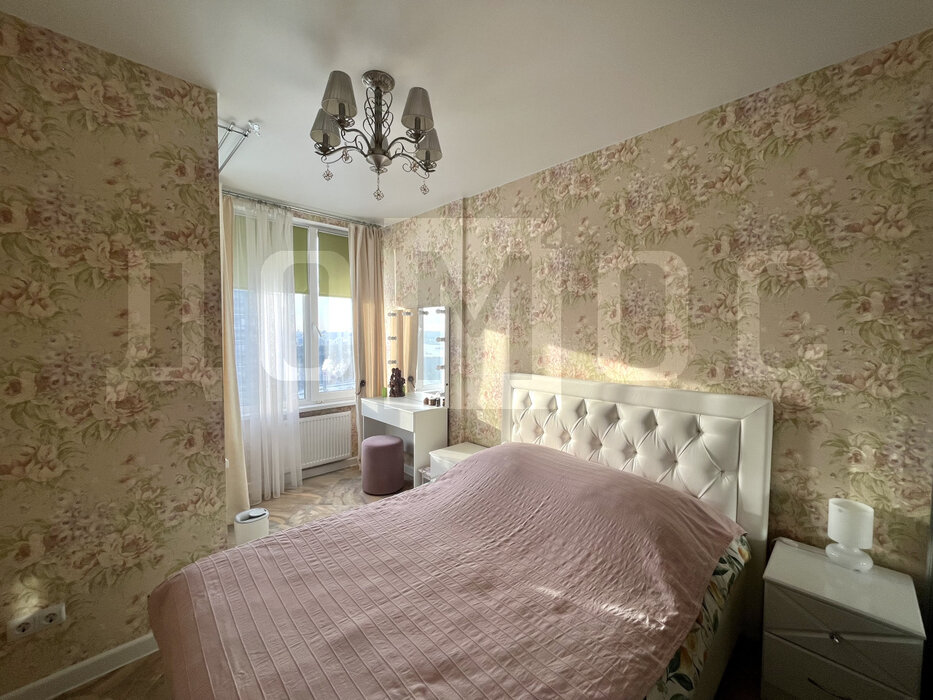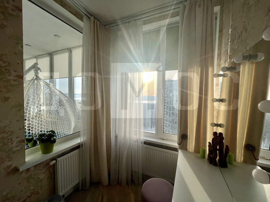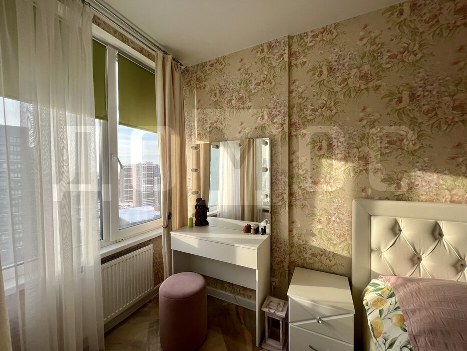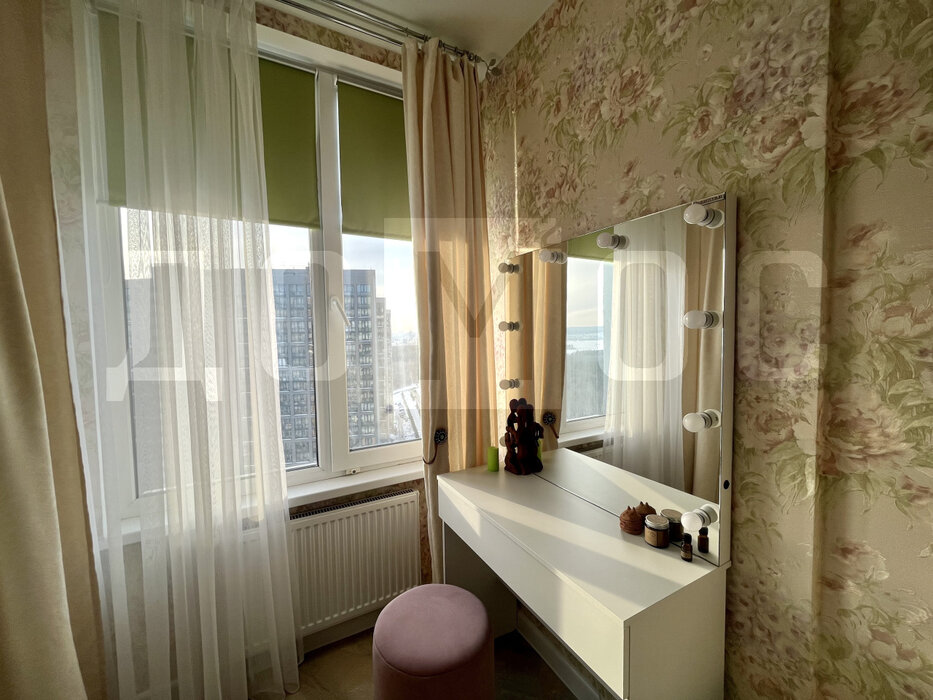 Квартира расположена на 21 этаже.В ванной и на лоджии тёплые полы.В стоимость входит всё необходимое для комфортного проживания: качественный кухонный гарнитур с варочной панелью, духовым шкафом-микроволновой печью, вытяжкой, посудомоечной машиной; холодильник, удобный раскладной диван, стол, барные стулья, оборудованная гардеробная, двуспальная кровать, матрас Аскона, две прикроватные тумбы, пуф, гримёрный столик, электрополотенцесушитель, подвесное кресло, телевизор, комод, стиральная машина, водонагреватель, гардины, шторы, шкаф-купе в прихожей, светильники.
