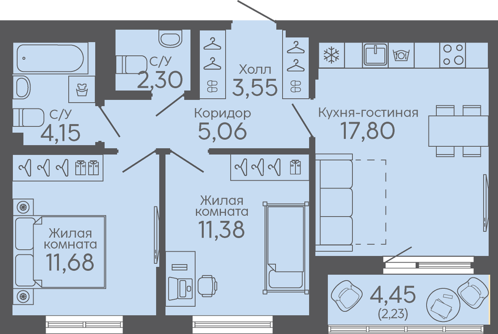 Общая площадь:58.15 м2
