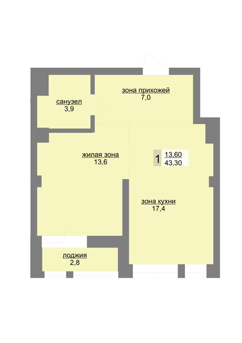 Общая площадь:43.3 м2
