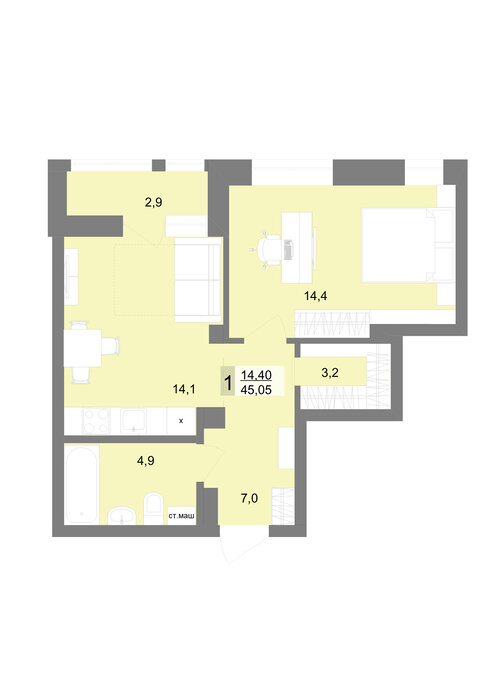 Общая площадь:45.05 м2