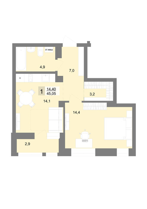 Общая площадь:45.05 м2
