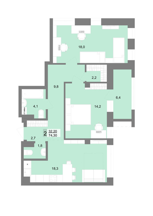 Общая площадь:74.3 м2