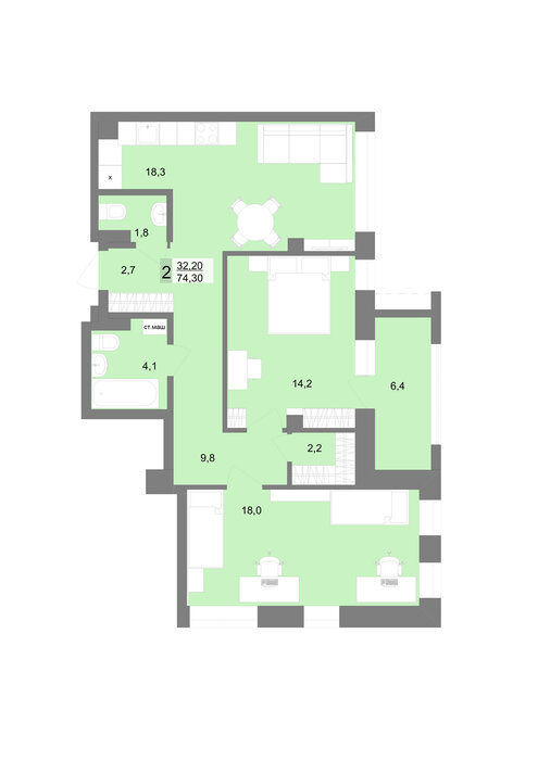 Общая площадь:74.3 м2