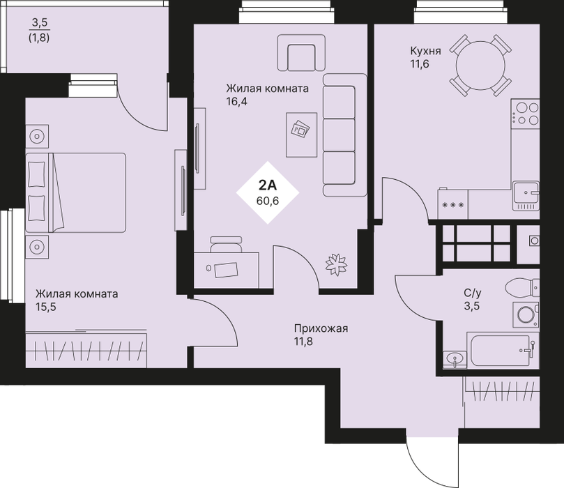 Общая площадь:60.55 м2