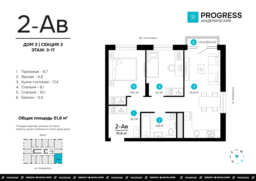 • 1-к квартира, Амундсена, 130/2, ЖК "PROGRESS (Прогресс) Академический"