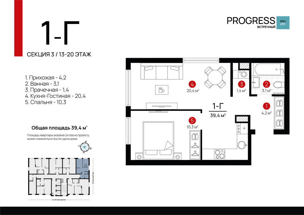• 1-к квартира, Ветеринарная, 16/1, Жилой комплекс “PROGRESS Встречный” — 1 кв. 2026 г.