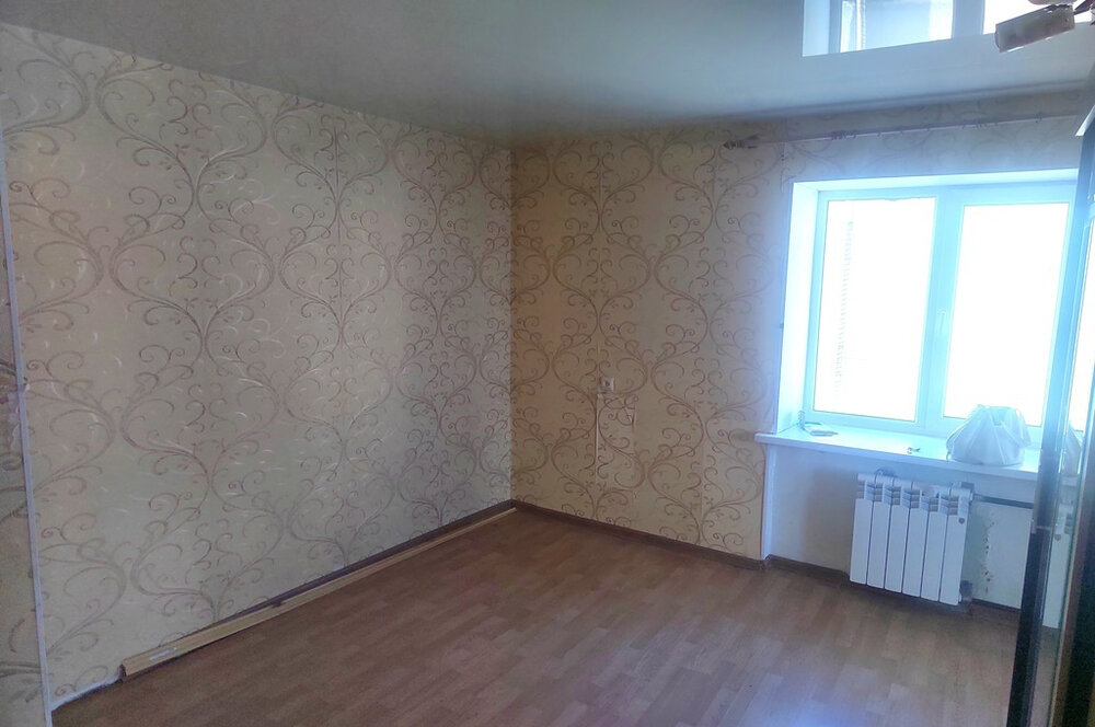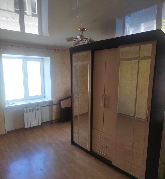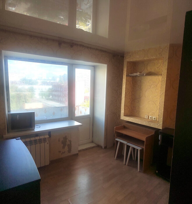 Квартира на 5м этаже, два года назад заменены радиаторы, пластиковые окна, санузел в плитке, с крышей проблем никогда не было. Площадь комнаты 19 м2, два окна, можно разделить на две зоны (на фотографии представлен такой вариант с помощью шкафа). Подъезд чистый, поменяны окна, соседи спокойные.