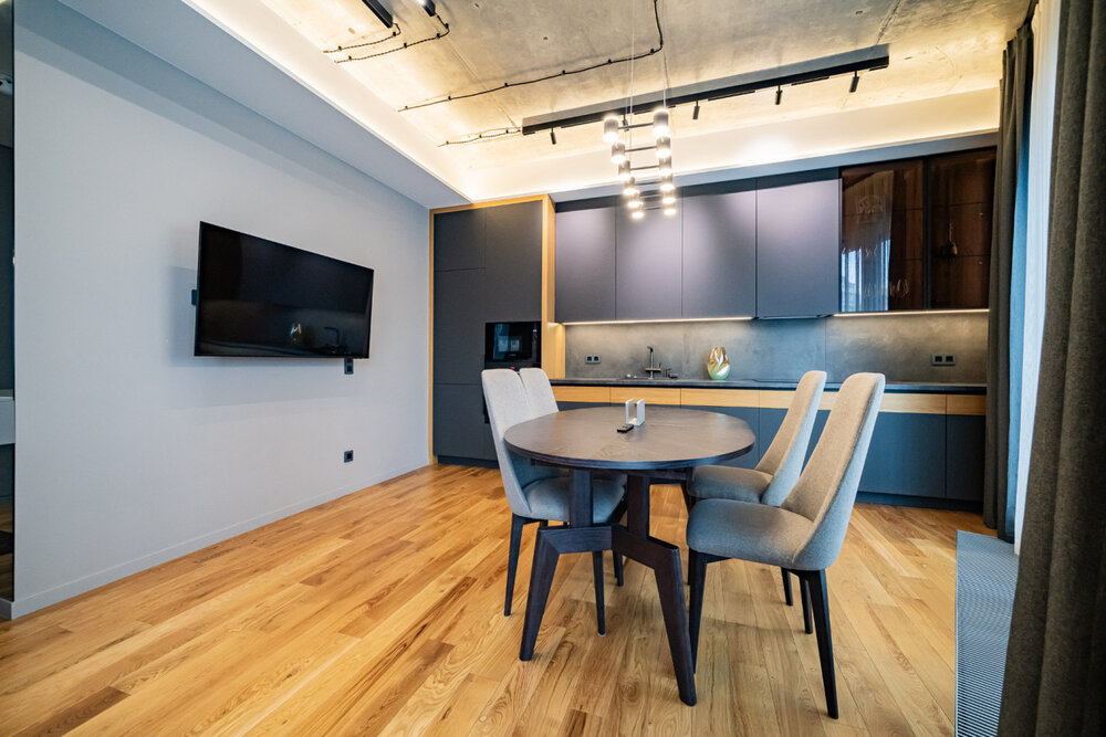 -дизайнерский ремонт, выдержано в едином стиле, спокойные выдержанные тона-Высота потолков 3 метра-Кухня-гостиная 22,8 кв.м, спальня 16,31 кв.м., детская 13,28 кв.м., постирочная 4,23кв.м.-Кондиционирование-теплый пол-Большая площадь остекления и высокие потолки 3-5 метров это пространство и комфорт, свет и легкость-что остается : все ,что на фото, кроме стола , стульев, дивана, стиральной машины, сушки(обсуждается)