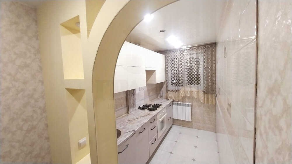Сами стены помещения кухни также выложены плиткой. Местами требуется обновить "косметику". Покупателю останется кухонный гарнитур, кондиционер, мебель и сантехника в ванной, большой шкаф-купе в зале.