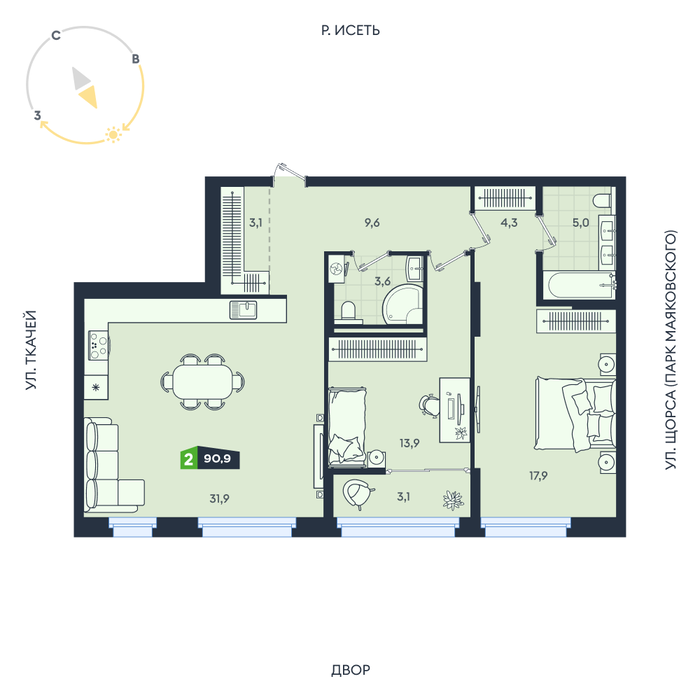 Общая площадь:90.9 м2