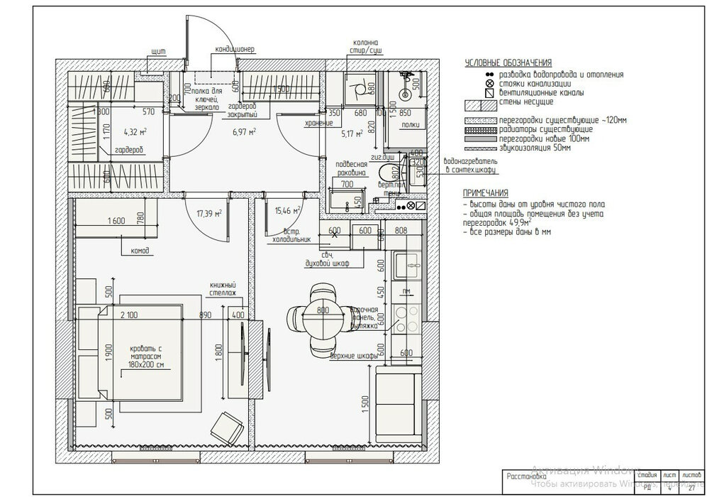 - эргономичная планировка 49,9 м² (спальня 17,4 м2, вместительная кухня гостиная 15,4 м2, гардеробная 4,3 м2);