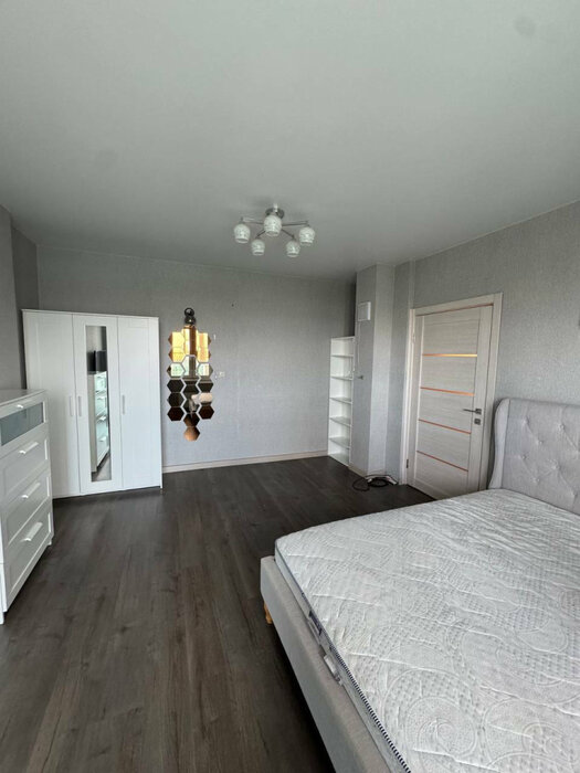 Спальня: остается телевизор, кровать с матрасом, шкаф. Здесь же располагается балкон. В комнате много света.
