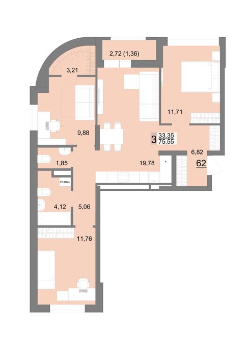 Общая площадь:75.55 м2