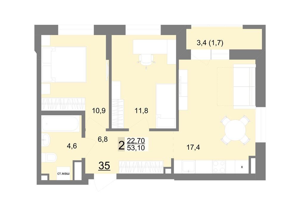 Общая площадь:53.1 м2