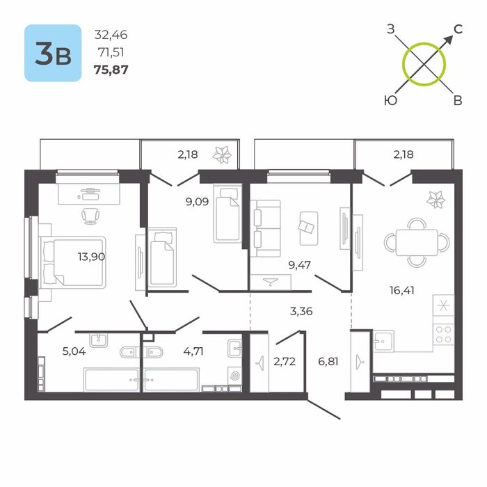Общая площадь:75.87 м2