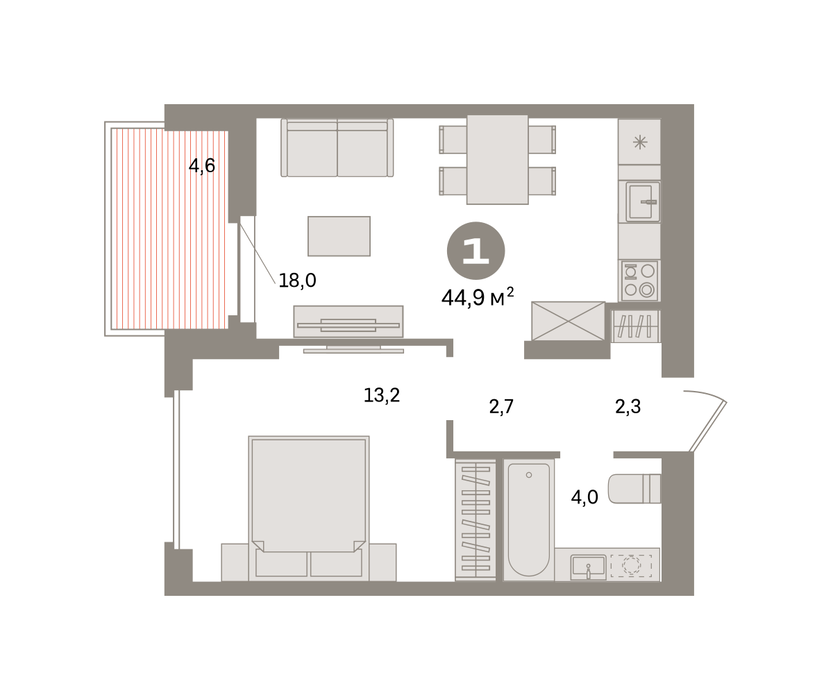 Квартира с кухней-гостиной и одной спальней в квартале «Депо». Особенности планировки: предчистовая отделка, балкон.