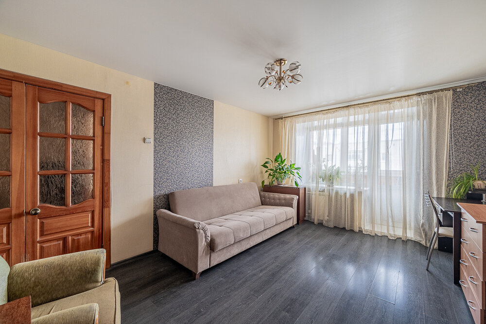 Функциональная кухня 7,5 кв.м., большая гостиная комната 17,4 кв.м. с застекленной лоджией 1,8 кв.м., спальня 12 кв.м. и просторный коридор 10,6 кв.м.