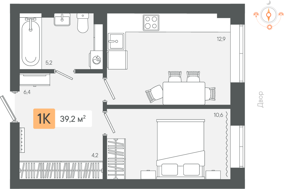 Первая очередь состоит из 4 домов по 6-8 этажей, окружающих просторный двор площадью 1 Га. Здесь размещены воркаут-комплекс, детские площадки по возрастам, стритбольная площадка, полоса препятствий, многочисленные зоны отдыха и амфитеатр под открытым небом. Парковка наземная, за пределами двора. Передача ключей — I квартал 2026 года.